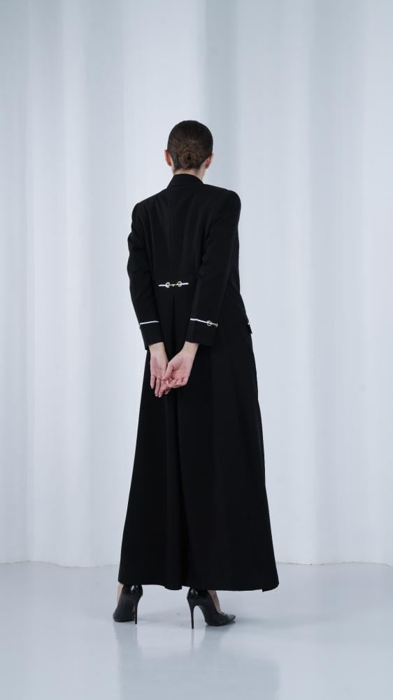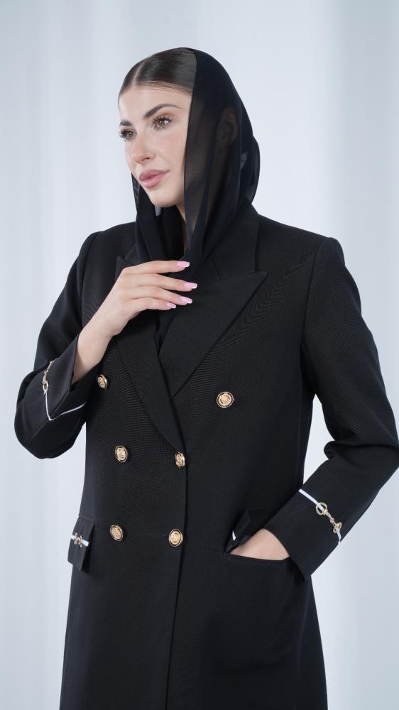 ٩٢٠ ر.سعباية رسمية أنيقة مصممة من قماش الكتان باللون الأسود ، مزينة بأزرار ذهبية معدنية ذات جودة عالية