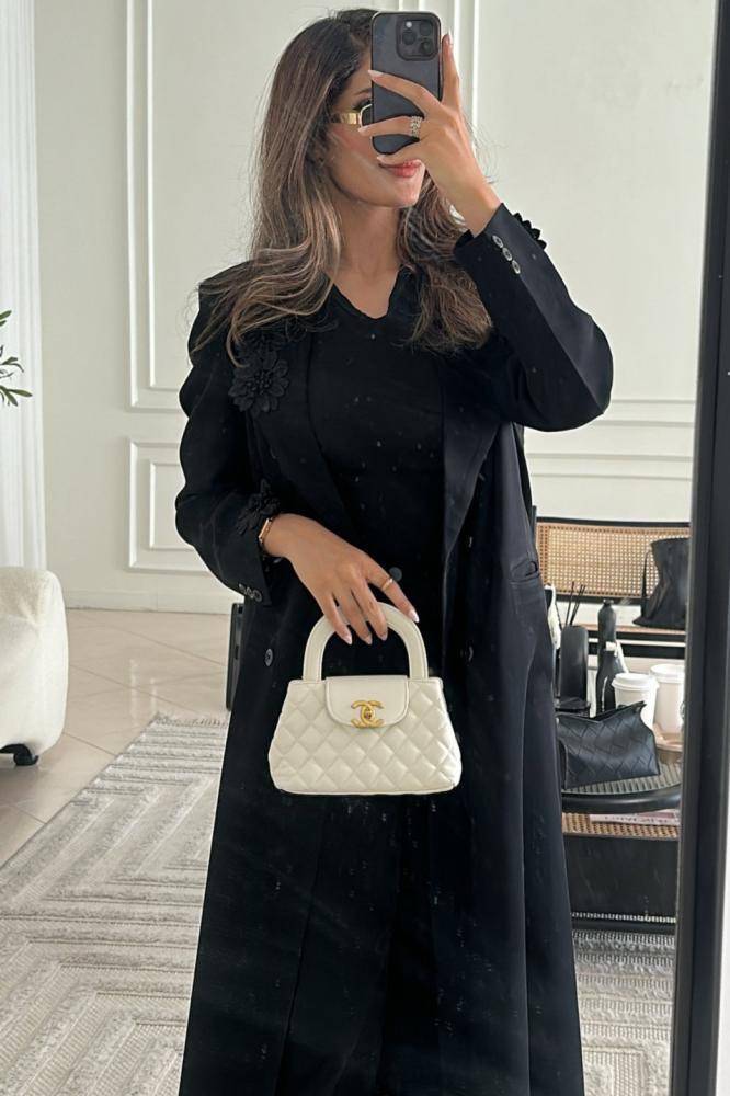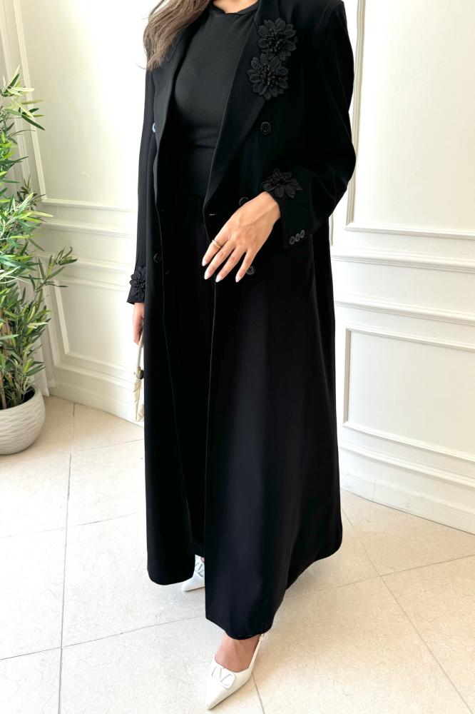 من قماش الكتان الهندي باللون الاسود الفاحم مع إضافة وردات على الكولر و الاكمام
